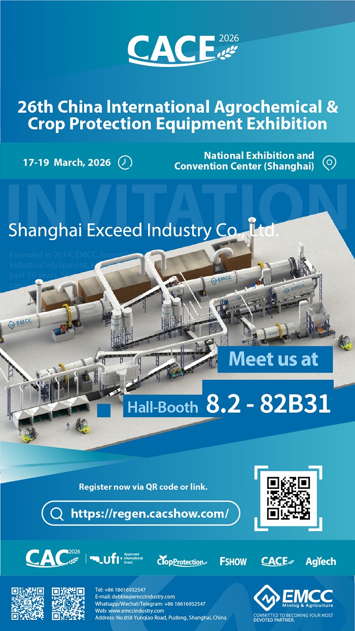 Shanghai Exceed Industry Co., Ltd. (EMCC) will participate in the 26th China international Agrochemical & Crop Protection Exhibition from March 17th to March 19th, 2026 (the world’s largest and most professional one-stop procurement and exchange platform for agricultural machinery and equipment, pesticides, fertilizers, seeds, irrigation, greenhouses, and smart agricultural machinery). We sincerely invite you to visit Shanghai for the exhibition.